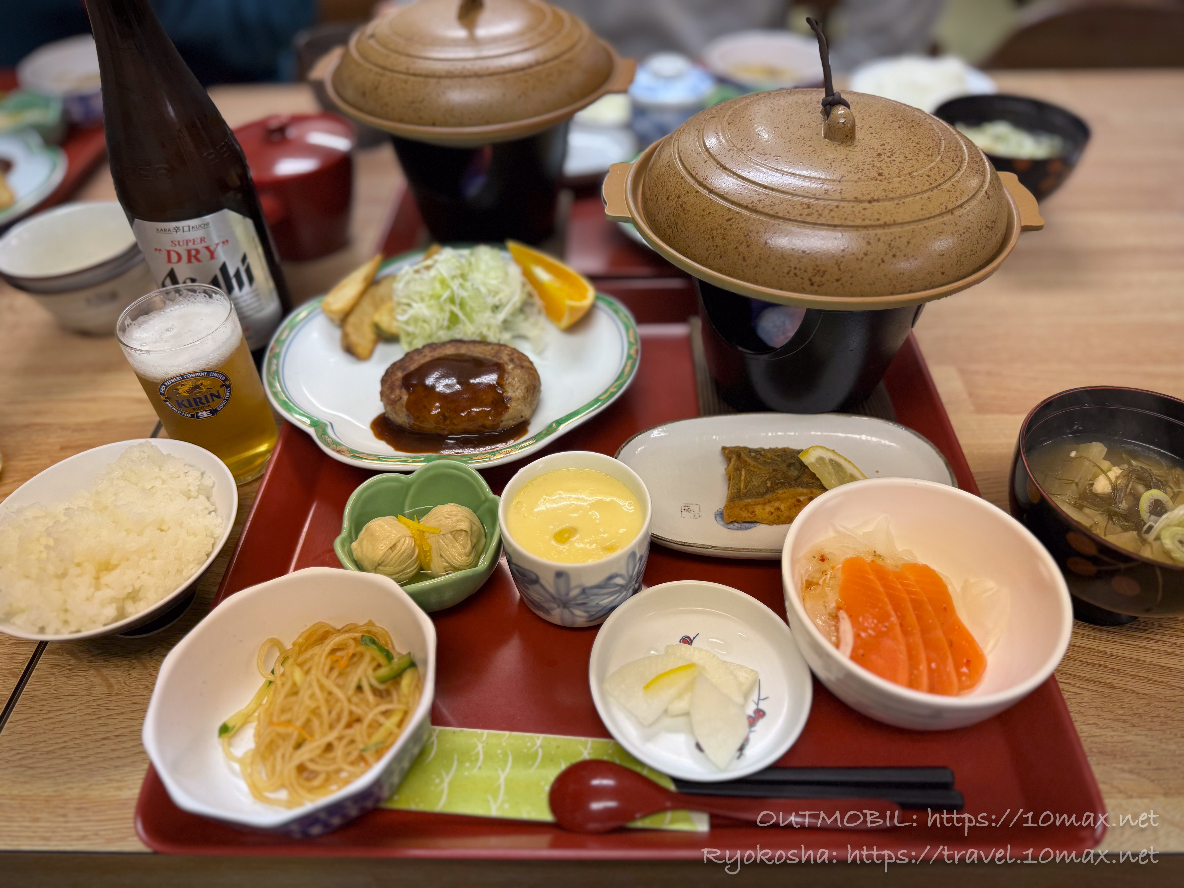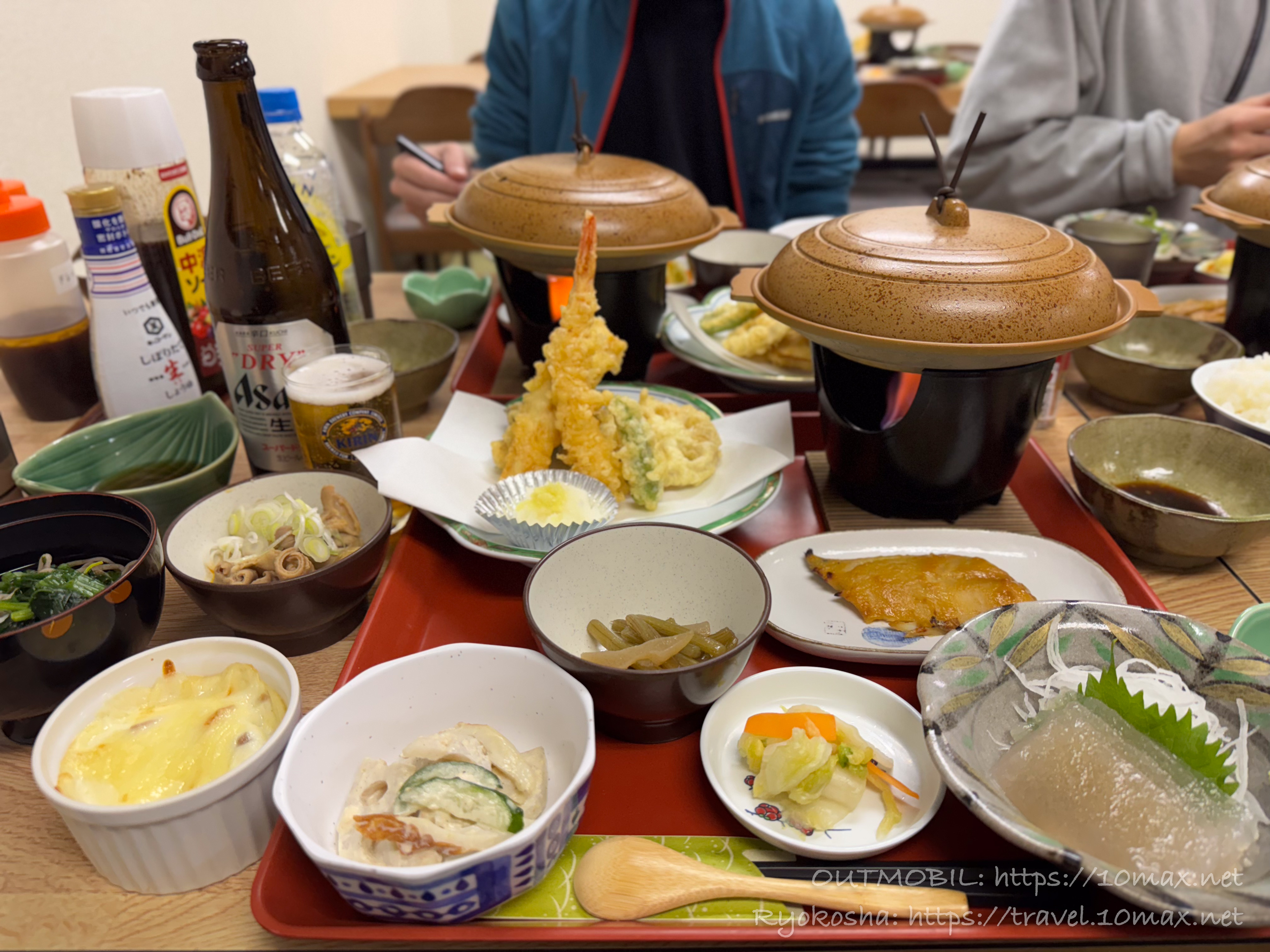 温泉に浸かり、夜の部を本格的にはじめていきます。マルイ旅館の飯は最高でした。