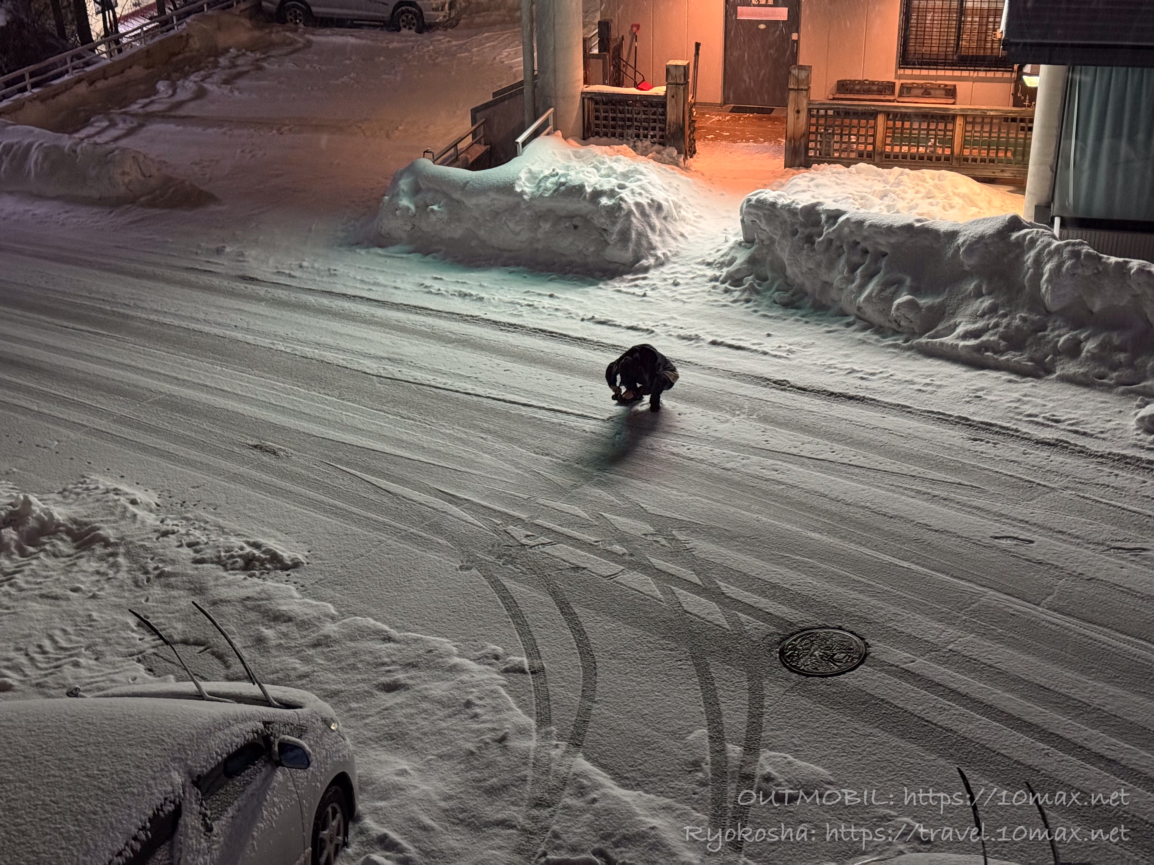 宿の外で不審者がいるように見えますが↓、これは雪景色を撮影している長男です。まあ軽く不審ですね。